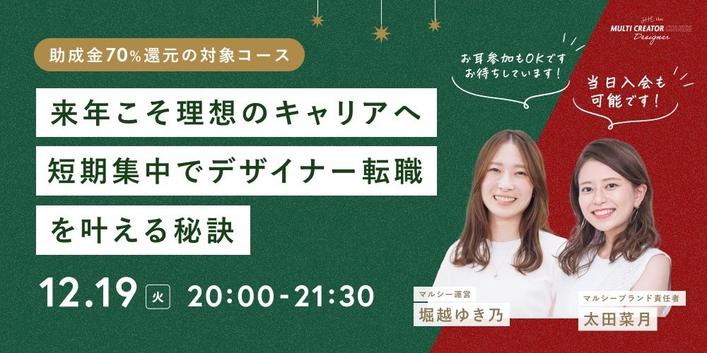 12月19日、「助成金70%還元の対象コース 来年こそ理想のキャリアへ 短期集中でデザイナー転職を叶える秘訣」を開催(現在は終了のため、無料体験レッスンをお申し込みください)
