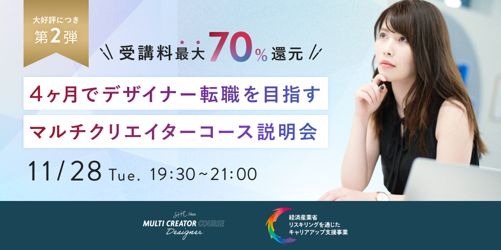 この度SHEが採択事業者に決定し、SHEが提供する「MULTI CREATOR COURSE Designer(https://cutt.ly/HwTo1sZo)」が補助対象事業に決定しました。本事業をご活用いただくことで、「MULTI CREATOR COURSE Designer」を修了すれば受講費用の50%(224,000円)が還元。さらに修了後に転職し、1年勤続された方は追加で受講費用の20%(89,600円)が還元され、最大70%(313,600円)の還元を受けることができます。