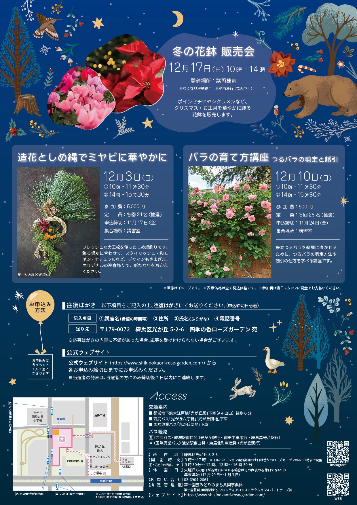 クリスマスコンサートやバラの育て方講座、しめ縄飾りのワークショップなどのイベントも開催