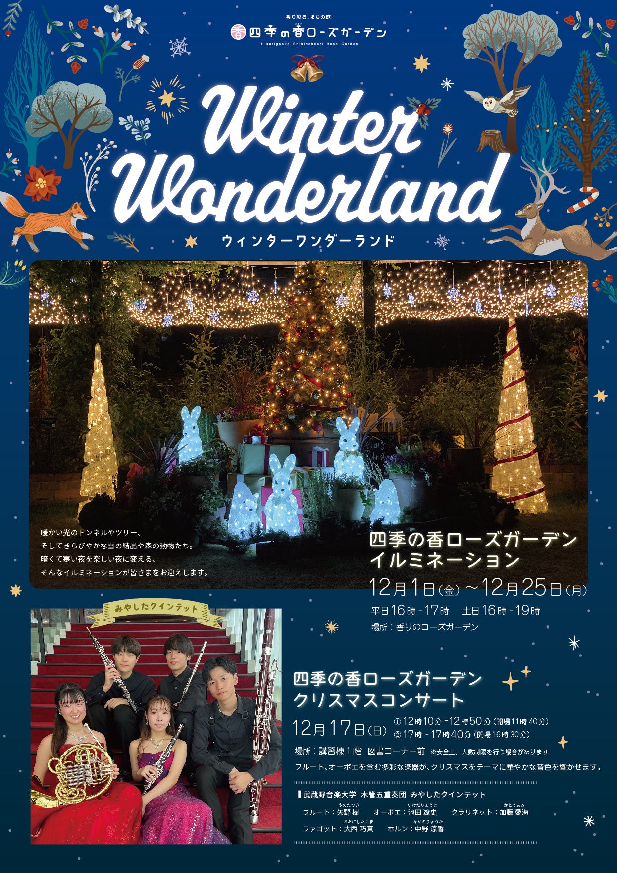 武蔵野音楽大学の木管五重奏団によるコンサートを開催します。フルート、オーボエを含む多彩な楽器がクリスマスをテーマに華やかな音色を響かせます。