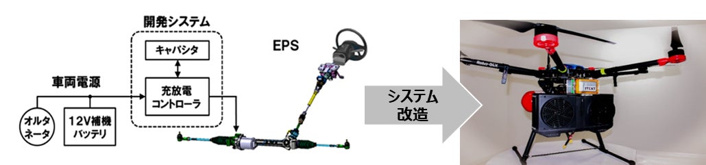 自動車向けに培った電源システムをドローン用48V電源に改造し搭載。ドローン電源電圧を最大65Vまで昇圧することを実現し、最大電力を最大出力2400Wから3250Wまで引き上げ。