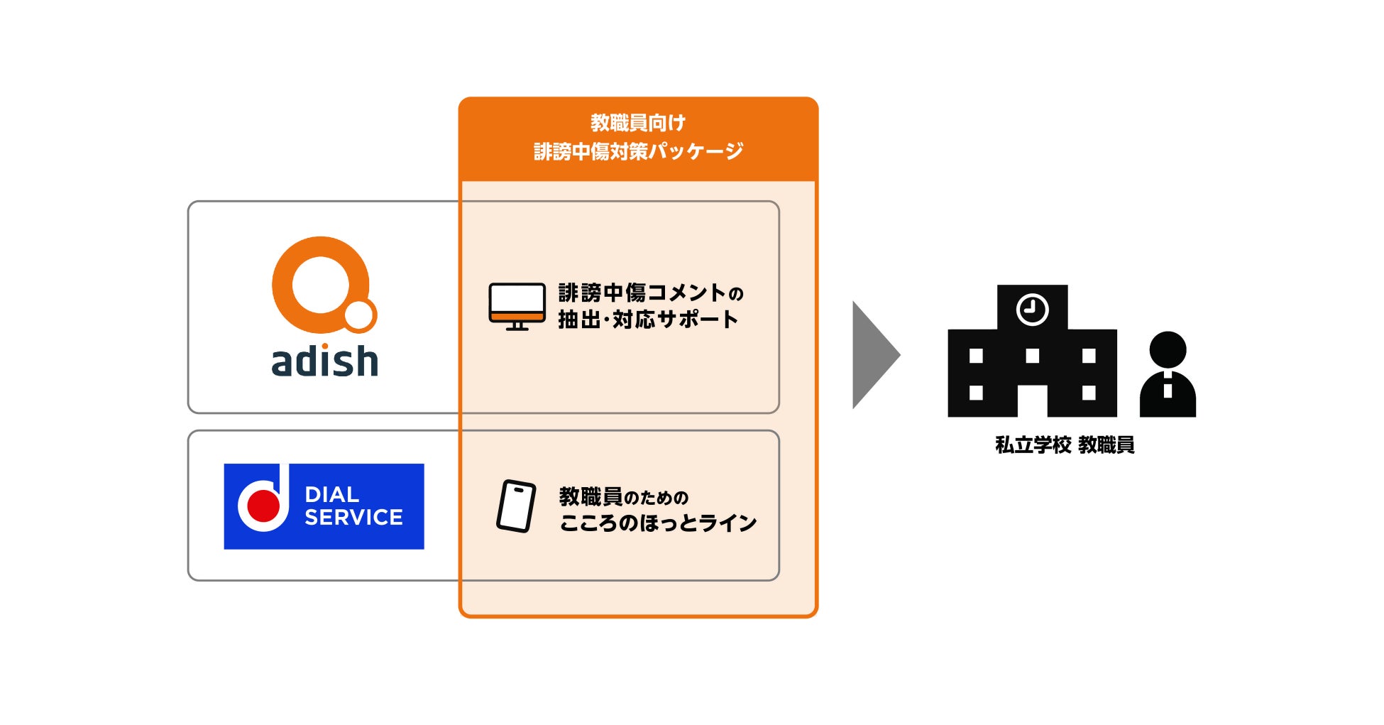 そこでアディッシュは、教職員がインターネット上で誹謗中傷を受けた投稿の検知を、ダイヤル・サービスは、問題をきっかけに悩みやこころに不調が発生したときに相談できる窓口、専門家によるホットラインサービスの提供を行います。