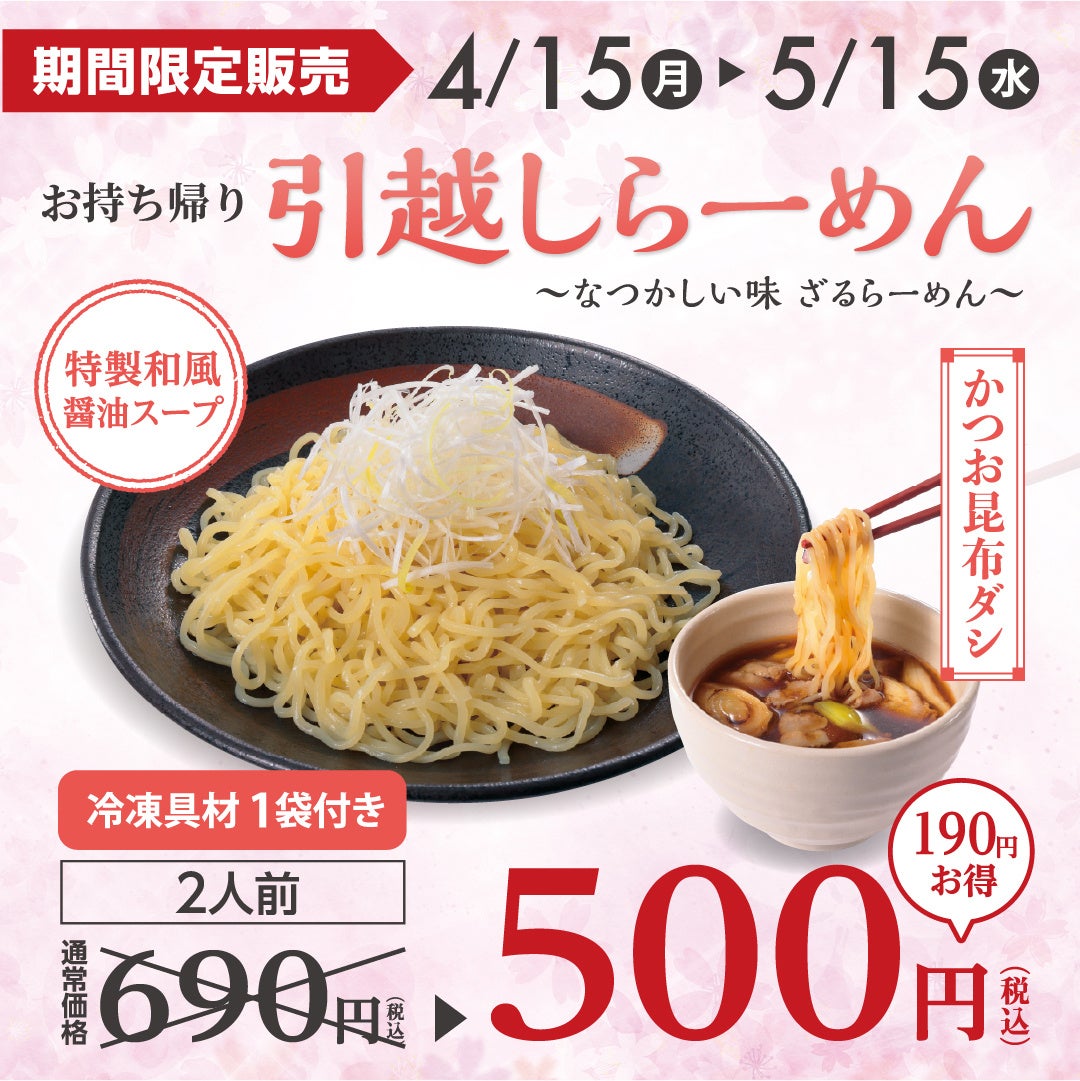 また、新年度の手土産として大好評販売中の、お持ち帰り「引越しらーめん」(2食入り)通常価格690円(税込)を、2024 年4月15日(月)~5月15日(水)まで、500円(税込)の特別価格で販売いたします。