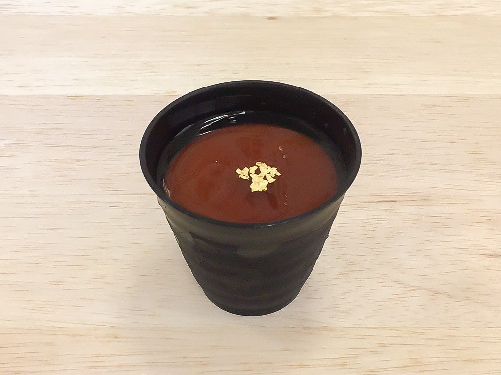 くず餅の原料である450日間熟成発酵させた小麦澱粉を牛乳、生クリームで丹念に練りあげ、もっちりとした食感を生み出しました。上には船橋屋の黒蜜を使用したゼリーを流し入れ、濃厚でやみつきになる和洋スイーツに。金箔をかけた上品で贅沢な商品となっております。