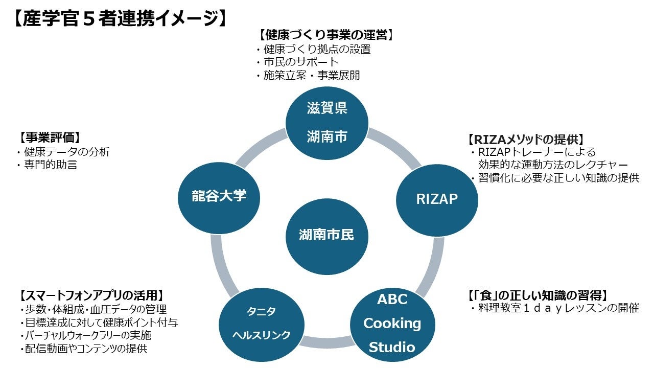 RIZAPグループ株式会社(代表取締役社長 瀬戸 健、本社:東京都新宿区)の連結子会社であるRIZAP株式会社(以下、「RIZAP」)は、滋賀県湖南市(市長 生田邦夫)、学校法人龍谷大学(社会学部 教授 井上 辰樹、京都府京都市)、株式会社タニタヘルスリンク (代表取締役社長 土志田 敬祐、本社:東京都港区)、株式会社 ABC Cooking Studio(代表取締役社長 兼 CEO志村なるみ、本社:東京都千代田区)とのパートナーシップ協定を2024年6月3日に締結いたしましたのでお知らせいたします。