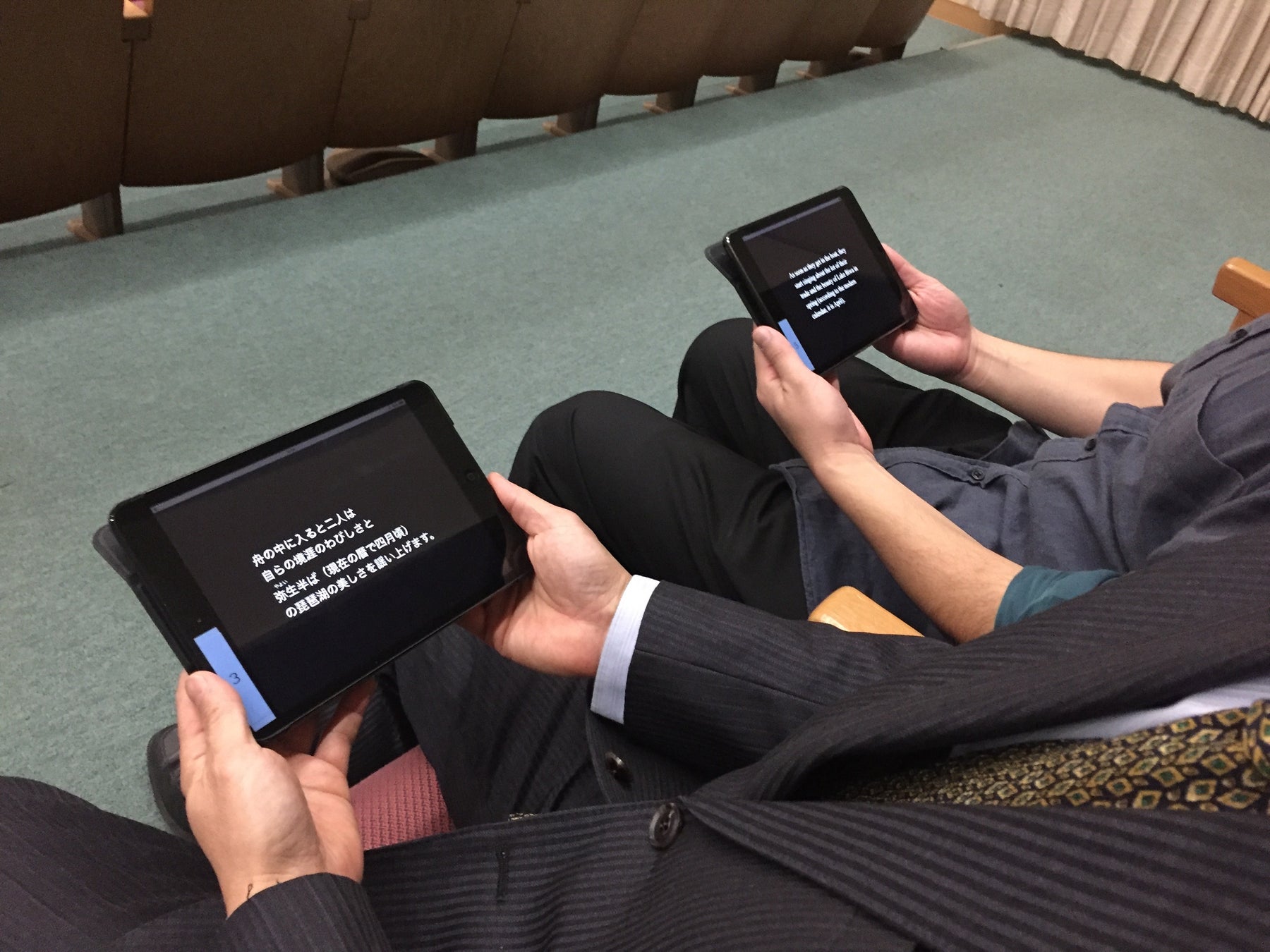 第一夜から第三夜には、能楽鑑賞に役立つ解説をご覧いただける多言語字幕システムを導入。字幕は舞台と連動しており、大きな文字で分かりやすく表示します。画面光量制限、スピーカー機能OFFタブレットのため劇場内での使用も安心です。多言語対応のため、外国の方のガイドとしても活用いただけます。