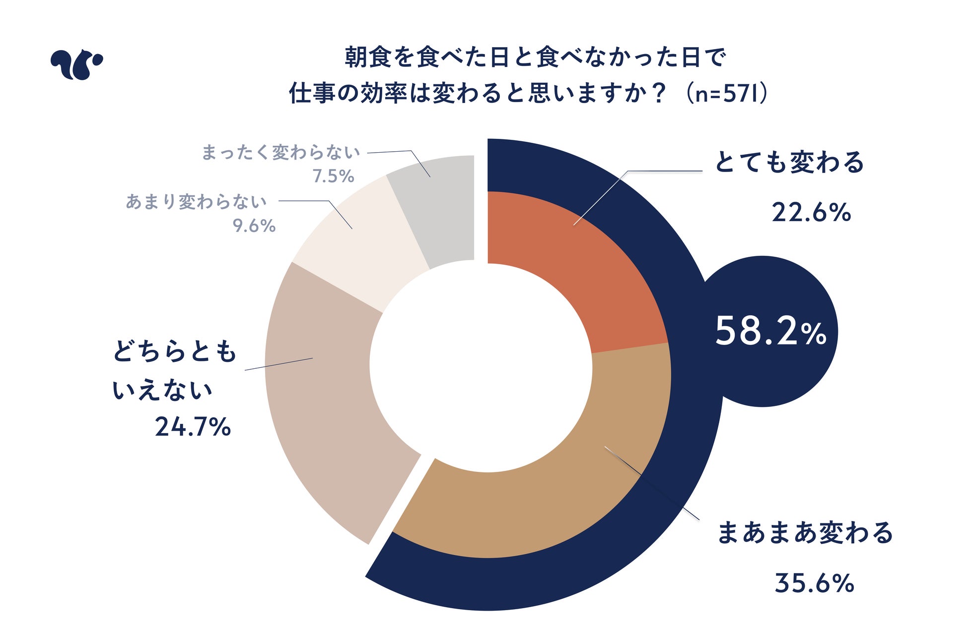 また、普段から朝食を食べる人・食べない人両方を含めた全員に、朝食の有無でその日1日の仕事の効率が変わるかを聞いたところ、約6割が「変わる」と答えた。