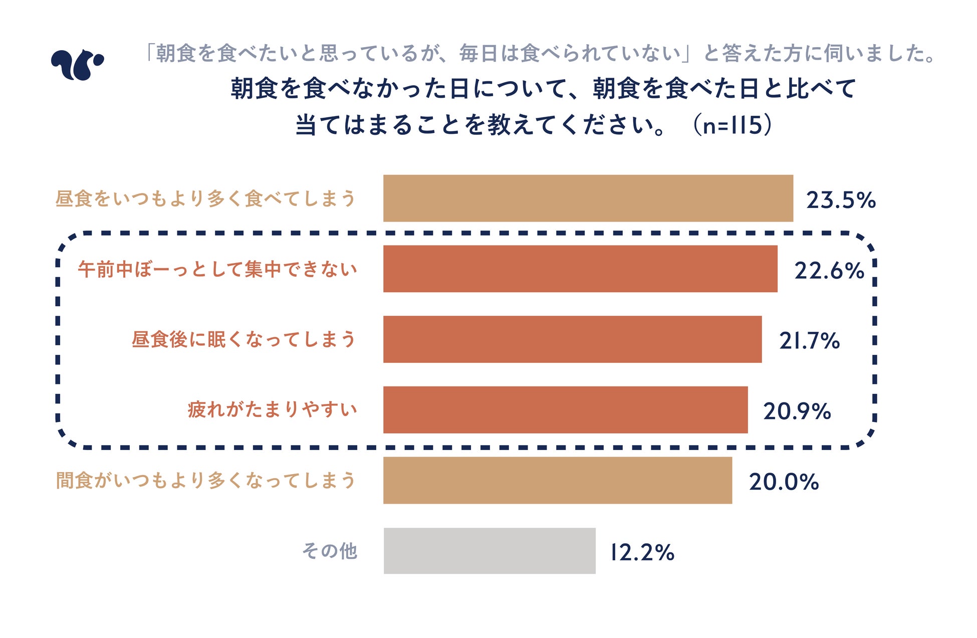 ・「朝食を食べない/食べたいが食べられていない」理由については「食欲がでない(39.4%)」、「準備や片付けをする時間がない(32.8%)」、「朝食を何にするか考えて準備することが面倒(21.7%)」の順で多い結果に。「食べたいと思っているが、毎日は食べられていない」人は、朝食を食べなかった日は昼食や間食の量が多くなってしまうばかりでなく、「午前中集中ができない(22.6%))、「昼食後に眠くなってしまう(21.7%)」、「疲れがたまりやすい(20.9%)」など、業務に直接悪影響が出そうな状態になると回答した。