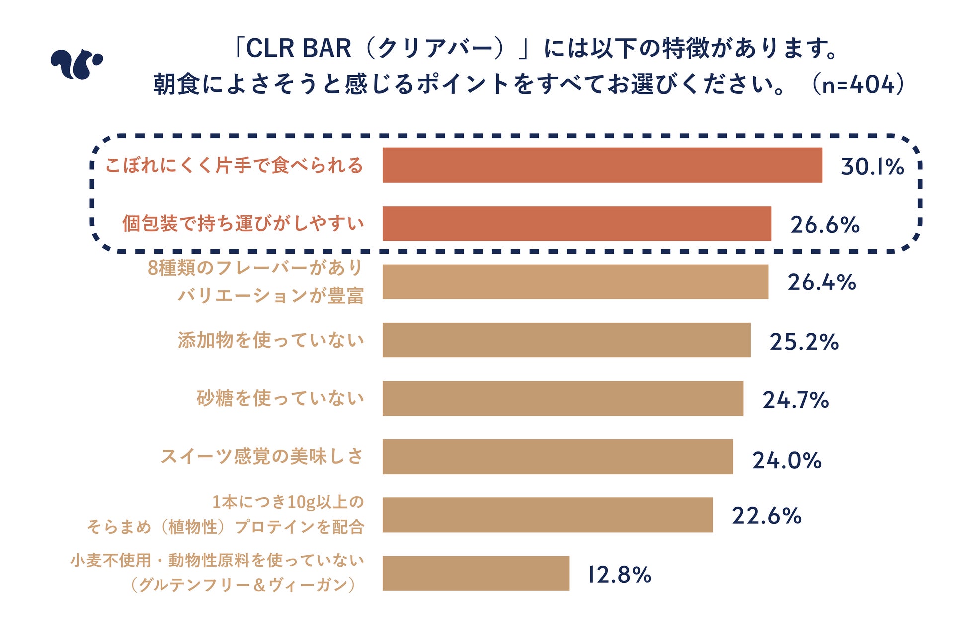 今回の調査対象者に、「CLR BAR(クリアバー)の特徴の中で朝食に適していると感じたポイントを聞いたところ、「こぼれにくく片手で食べられる(31.1%)」、「個包装で持ち運びがしやすい(26.6%)」の2つが上位となりました。
