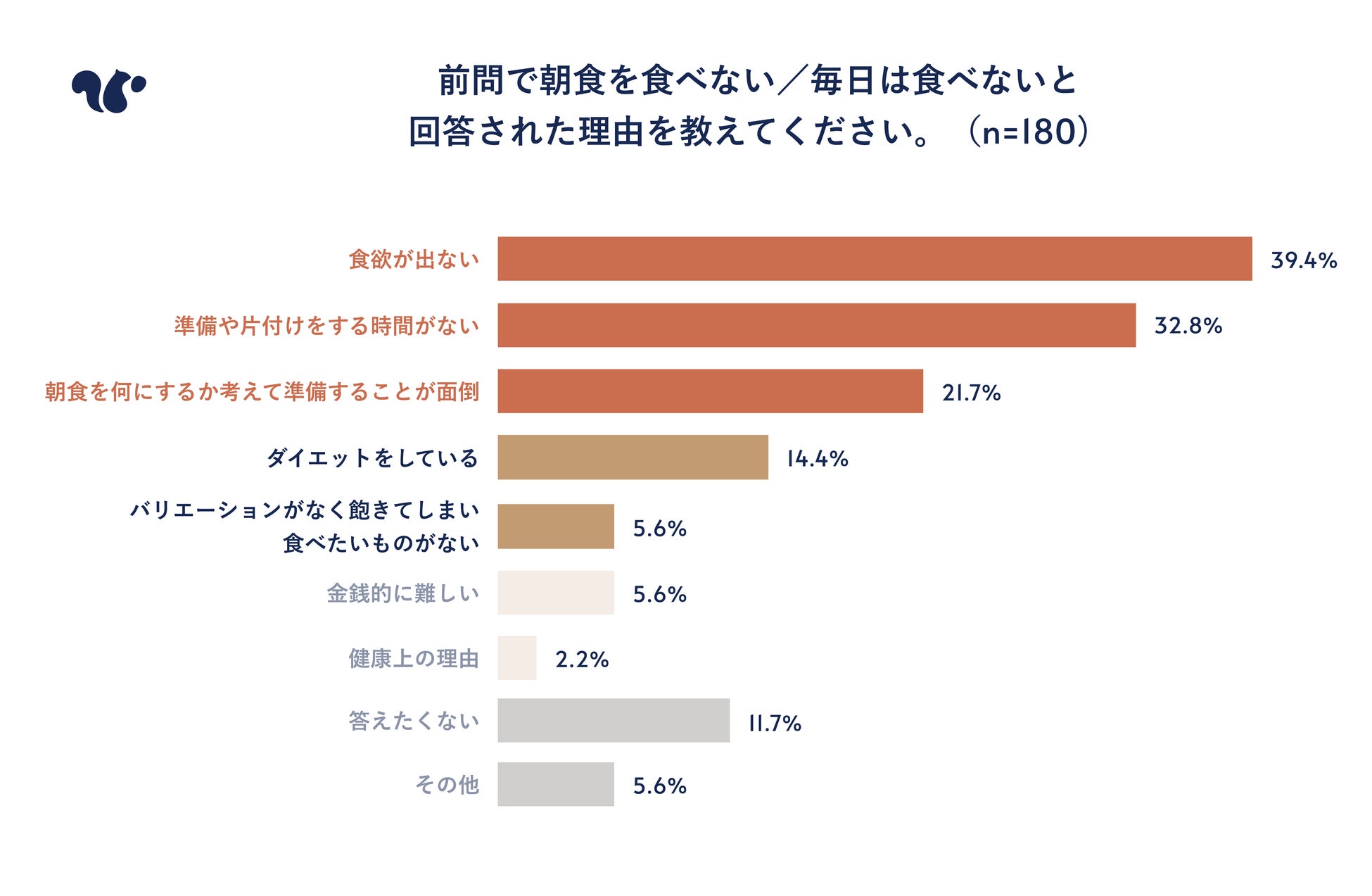 さらに、朝食を食べない/食べられない理由として多くあげられたのは「(起床したばかりで)食欲が出ない(39.4%)」、「準備や片付けをする時間がない(32.8%)」、「朝食を何にするか考えて準備することが面倒(21.7%)」などの忙しない朝ならではの理由だった。