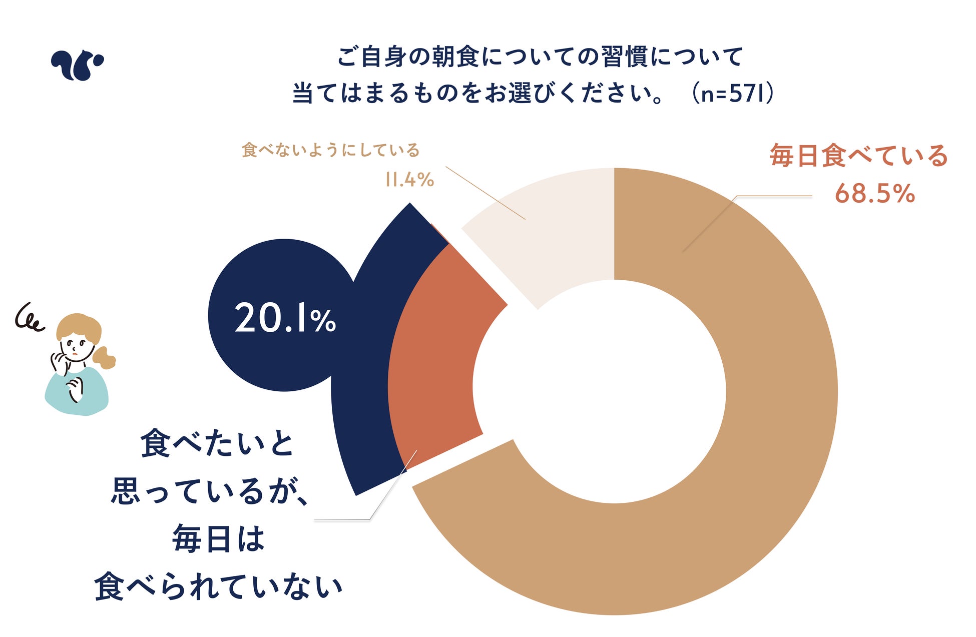 ・「朝食を毎日食べる」と答えた人は全体の68.2%。「食べたいと思っているが、毎日は食べられていない」と答えた人は20.1%という結果となり、5人に一人は朝食を食べたいと思っているが食べられていないことが明らかに。