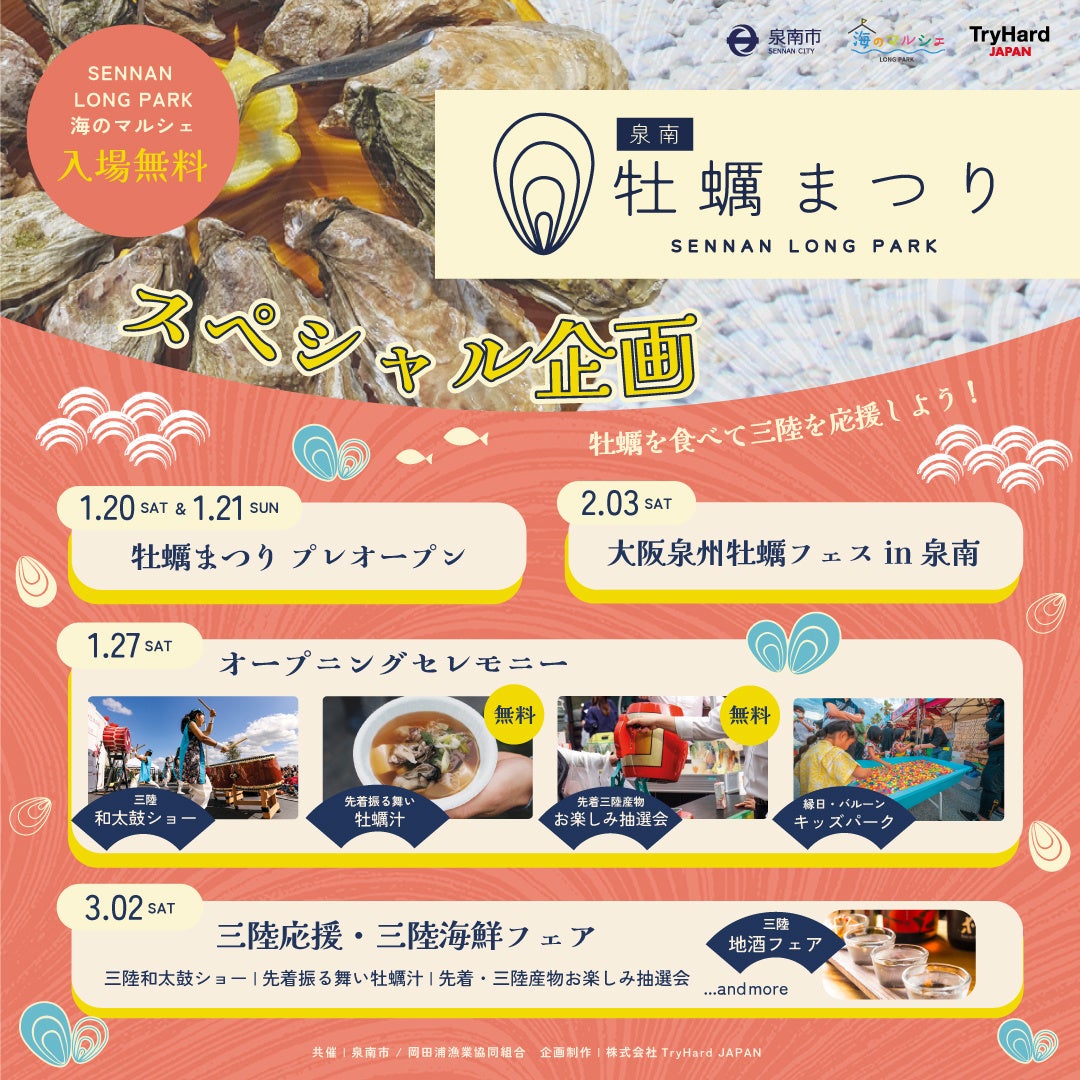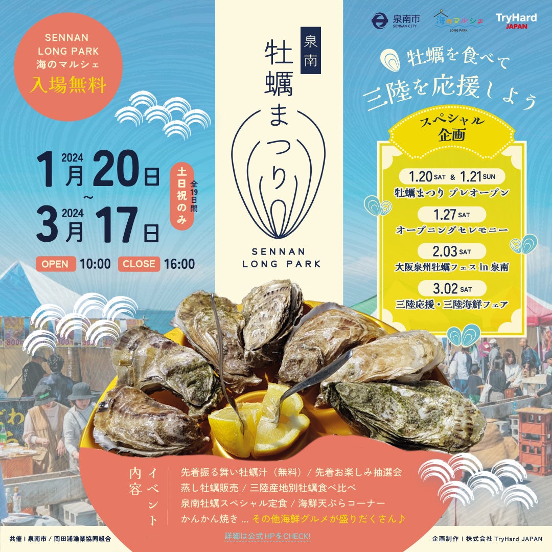 牡蠣を食べて三陸を応援!SENNAN LONG PARK海のマルシェで「泉南牡蠣まつり」 1月20日(土)~3月17日(日)開催決定