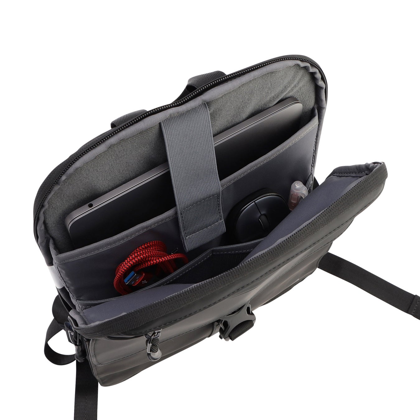 収納性に優れた2WAY仕様の縦型トートバッグタイプ。ショートハンドルや取り外し可能なショルダーベルトにも加えて、キャリーバックに固定できるスリーブも備えており、出張などの際にも便利。また、タブレットスリーブや多彩なポケットを備え、たくさんのビジネスツールを整理して収納することができます。
