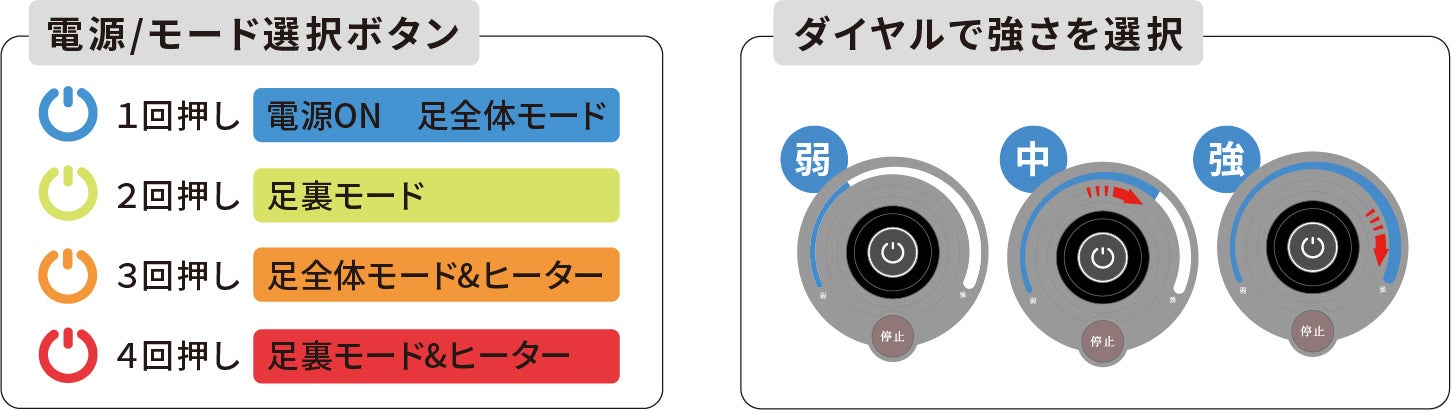 電源/モード選択ボタンでマッサージのモードを選択し、ダイヤルを回して強さを決めます。