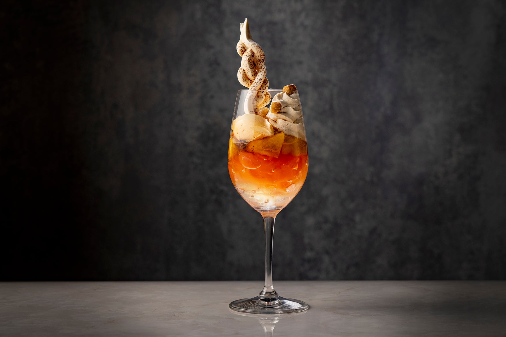 艶やかな色のグラデーションがグラスの中で輝く「ザ・エンペラー」は、大人な味わいのジンジャーライムゼリーに、柿のコンフィチュールとじっくりキャラメリゼした富士りんごのリッチな甘さが重なり合う風味豊かなパフェです。バニラシナモンクランブルがほのかなスパイスの余韻を添え、自家製柿のジェラートがまろやかに全体をまとめます。トップにはドライメレンゲをまるで樹氷のように飾った冬らしい一品です。