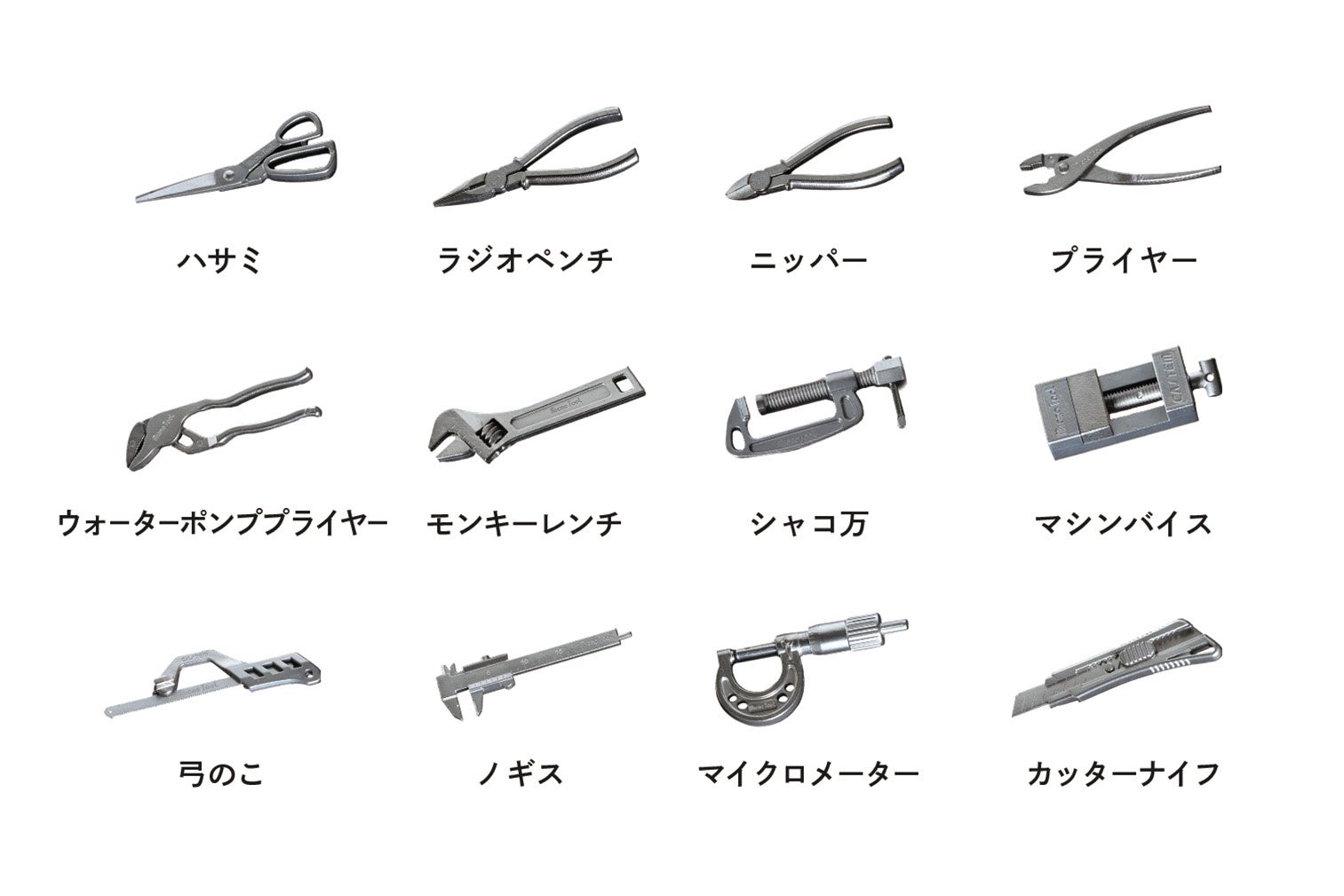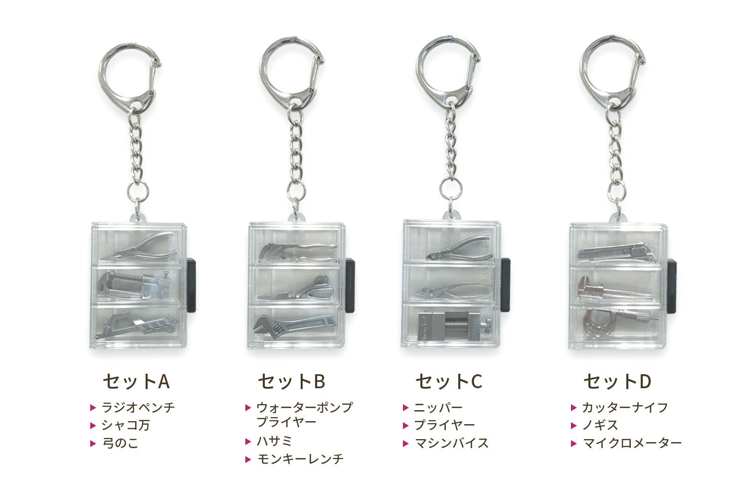 ラインナップは「ハサミ」「ラジオペンチ」「ニッパー」「プライヤー」「ウォーターポンププライヤー」「モンキーレンチ」「シャコ万」「マシンバイス」「弓のこ」「ノギス」「マイクロメーター」「カッターナイフ」の12種。3点セットは「セットA」から「セットD」の4種となっています。