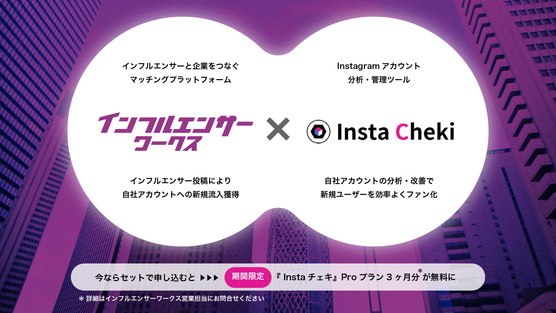 本セットプランでは、月額5万円(税別)から定額でインフルエンサーに対してお仕事を依頼し放題の「インフルエンサーワークス」とInstagramアカウントの分析・管理を行うことのできるInstagram分析ツール「Insta Cheki」を同時にご契約いただくことで、通常1万円(税別)のInstar Chekiプロプランを実質0円でご提供いたします。