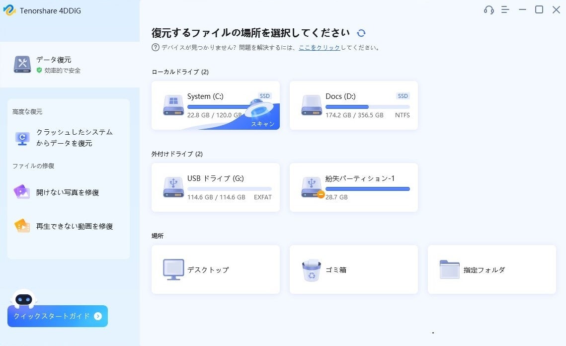 手順2.Tenorshare 4DDiGを起動させて、「外付けドライブ」を選択し、スキャンします。