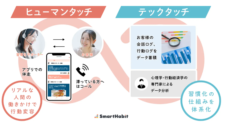Smart Habitは、社会心理学・行動経済学の専門家が、4万人分の行動データをもとに導き出した習慣形成理論に基づく、行動継続を支援するプラットフォームです。「三日坊主」をなくすことを目指し、習慣化サポーターとユーザーとの間に会話を通じてラポール(親密な信頼関係)を築くことで、離脱因子を徹底的に取り除き、継続的な行動を促します。
