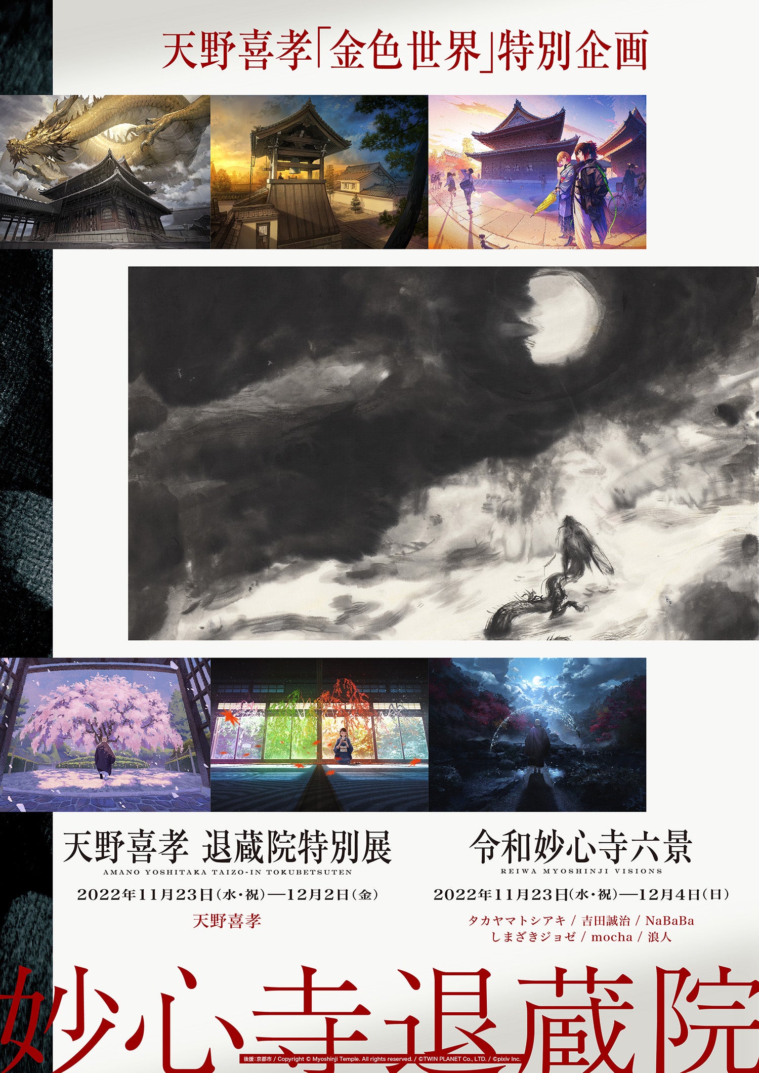 企画展「令和妙心寺六景」と「天野喜孝 退蔵院特別展」の2つを含む「天野喜孝『金色世界』特別企画」は、妙心寺で11月23日(水・祝)〜12月8日(木)に開催される「天野喜孝生誕70周年プロジェクト『金色世界 ~天野喜孝が描く無限の光~』」※1との合同企画です。