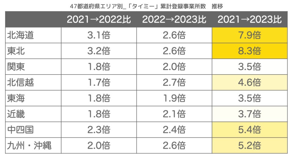 国内エリア別の事業所数の推移も北海道エリア・東北エリアでは、2021年-2023年比で約8倍となるなど高い伸び率となっています。