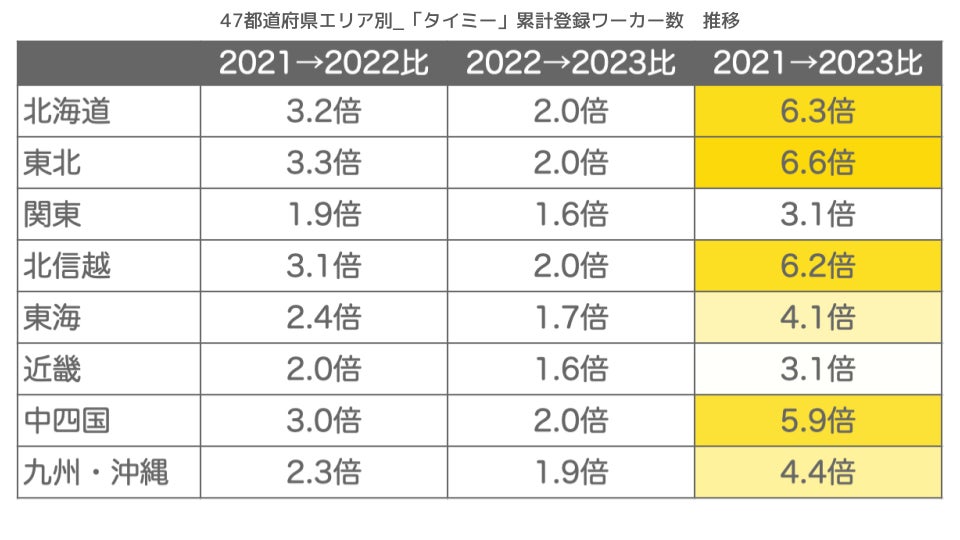 国内エリア別のワーカー数の推移も高い伸び率となっており、北海道エリア・東北エリア・北信越エリア・中四国エリアでは、2021年-2023年比で約6-7倍となるなど、日本全国でご利用いただけるサービスとして成長しています。