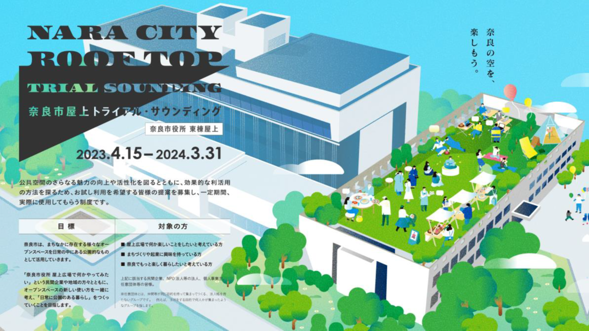 令和4年度10 月 15 日から 11 月 27 日、これからの学び場 遊び方のビジョンを提示する「コロガル公園 ® テラス」を開催した「奈良市役所 東棟屋上 」を対象 箇所 としてトライアル・サウンディングを実施します。