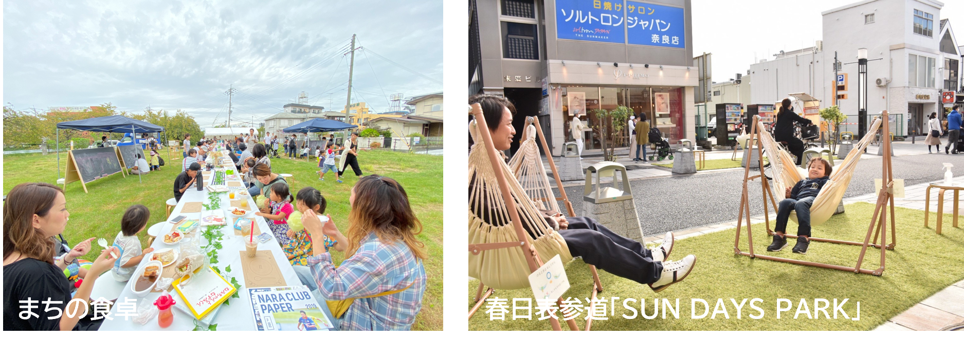 奈良市では 、 これまで「まちの食卓」や「春日表参道 SUN DAYS PARK 」など、都市公園や道路などの公共空間を活用した社会実験 や「日常に公園 の ある暮らし」をみんなで考える座談会「 P ARK LIFE MEETING 」 やワークショップ「 P ARK LIFELABO 」 を実施 するとともに、 2022年にまちびらき50周年を迎えた近鉄高の原駅を中心とした平城・相楽ニュータウン内の5つの公園をモデルとして選定し、公園利活用を促進させる「公園トライアル・サウンディング」を実施してきました。