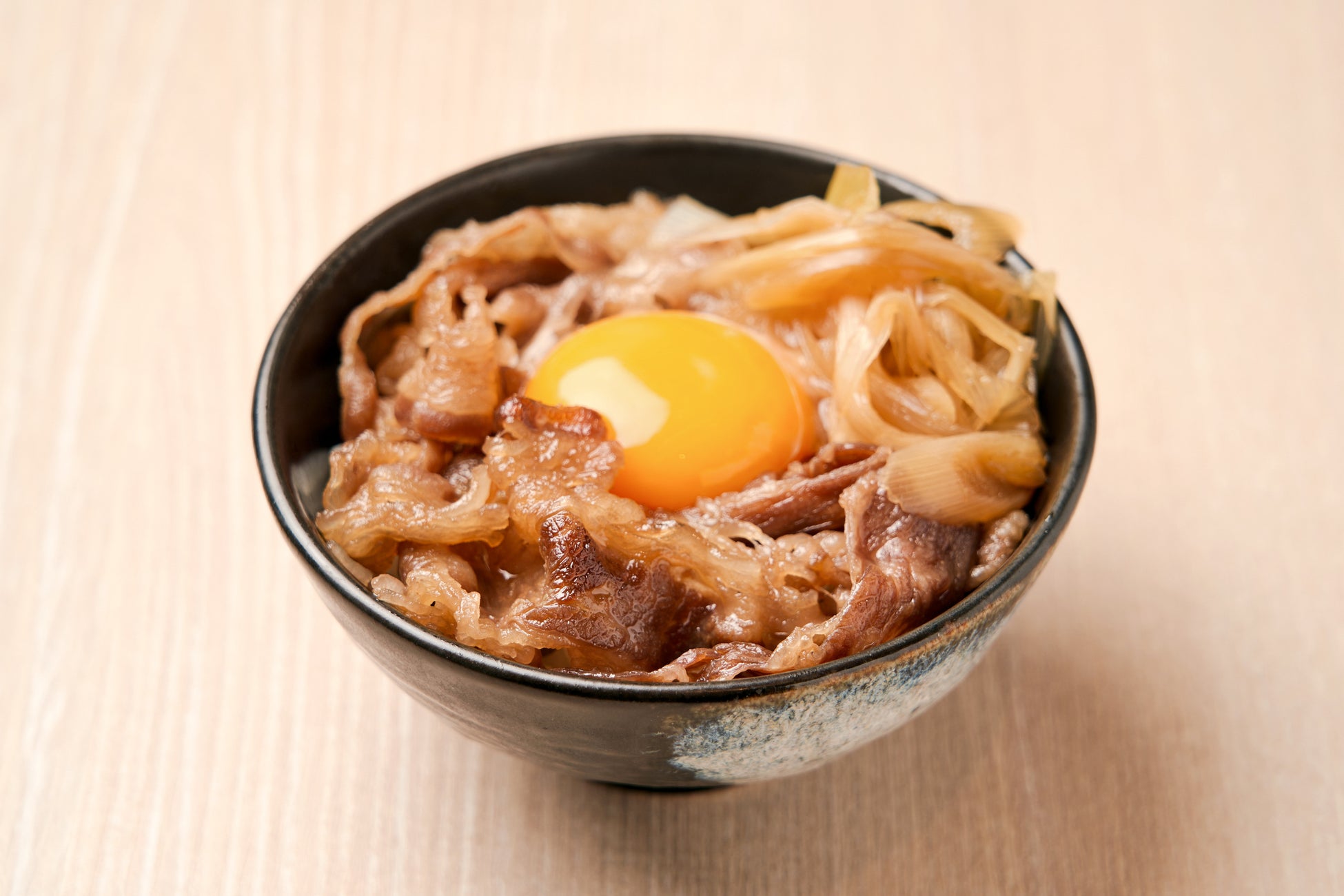 国産⿊⽑和⽜をすき焼き⾵にアレンジ︕薄切りにしたお⾁は⼝に⼊れた途端にとろけ出し、⽢みのある割り下と卵⻩と相まって深いコクと旨味を演出します。宮城県産「ひとめぼれ」が” 飲める”ようにすすみます。