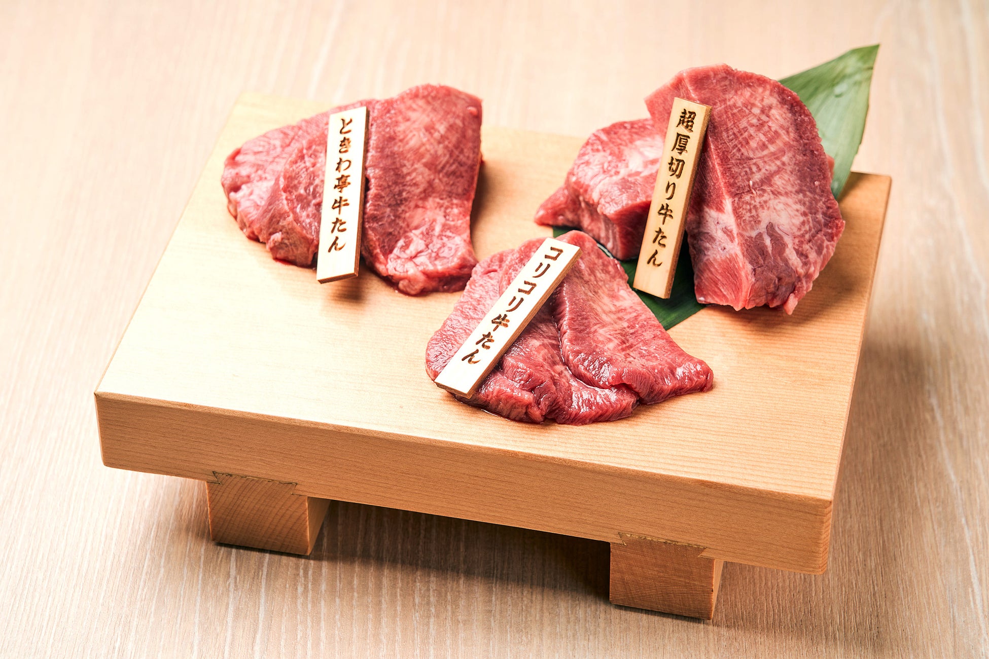 ⽜たん下駄盛り 「⽜たん焼き」に代表されるように仙台は⽜たんの本場。 タン元を厚さ30㎜にカットした「超厚切り⽜たん」、タン中を使⽤した「ときわ亭⽜たん」、⼼地よい⻭ごたえのタン先の 「コリコリ⽜たん」三種の盛り合わせです。 部位ごとの変化をお楽しみいただけます。