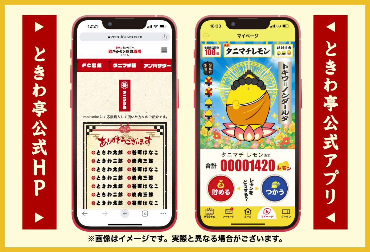 その他、Makuake限定で「ときわ亭焼⾁ハット」や「ときわ亭名⼊り⻩⾦トング」、店内のタブレット端末とアプリ内で告知ができる特別広告枠、公式アプリ内で”タニマチ”様のお名前を紹介するリターンもご⽤意しています。