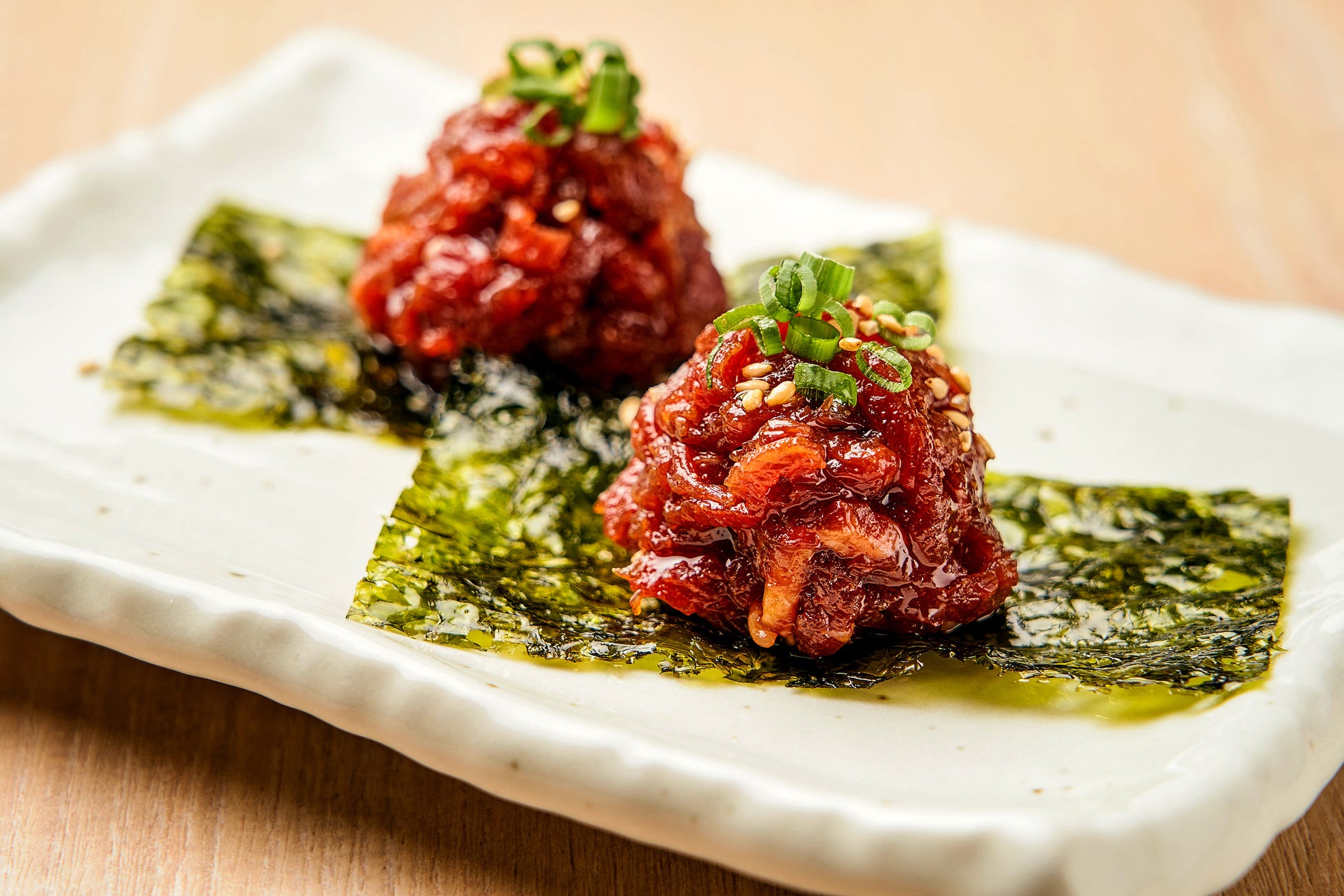 旨味の多い⾚⾝を低温調理でレア⾵に仕上げた合法ユッケ。 韓国のりで巻いて召し上がれ︕