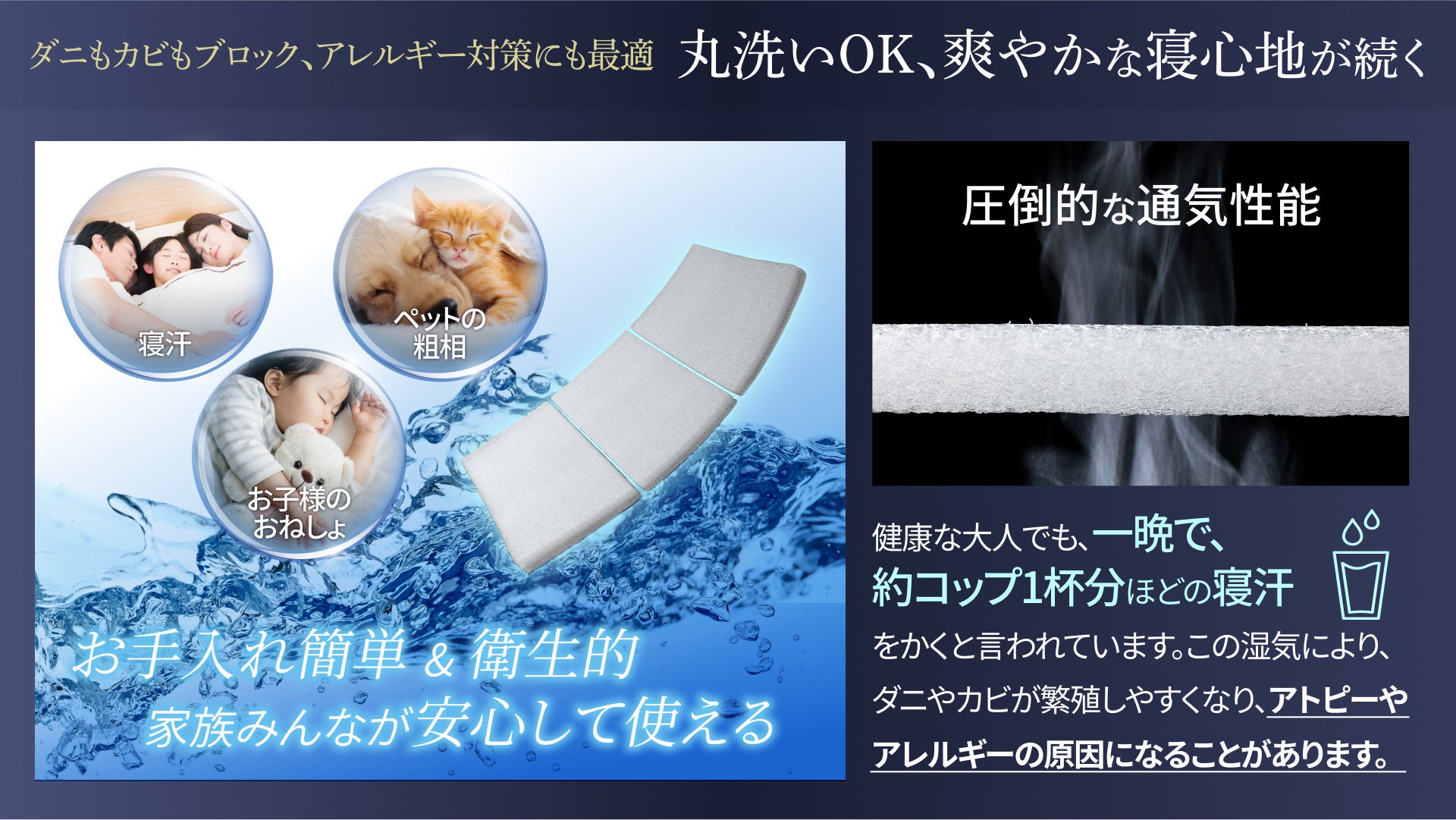 ウレタンマットレスは汗や皮脂を吸収し、数年で細菌の温床になりがちですが、「リライブファイバーマットレス」はカバーも中材も丸洗いが可能です。高通気構造により、汗や湿気がこもりにくく、ダニやカビの発生を抑制。寝汗が多い方やアレルギー体質の方にも、安心して長くお使いいただけます。