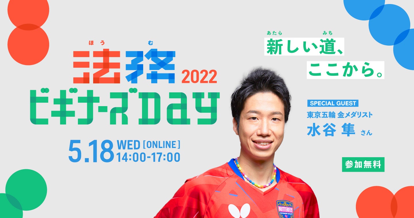 「法務ビギナーズDay2022」は、企業法務の新人や若手の方を応援するイベントです。昨年に続いて2回目の開催となる今回は、基調対談にスペシャルゲストとして、東京五輪卓球金メダリストの水谷隼氏と、法務として活躍するための心構えと行動力について紹介した『今日から法務パーソン』の執筆にも参加した、サントリーホールディングス明司雅宏氏をお招きし、人生やビジネス、企業法務に通ずる、「新人時代から活躍し、第一線で輝き続けるためのエッセンス」をお伝えします。その後のセミナー、トークセッションでも企業法務として活躍する講師陣が、法務のご経験が浅い方に向けて、これからの仕事に活きるコンテンツをお届けします。