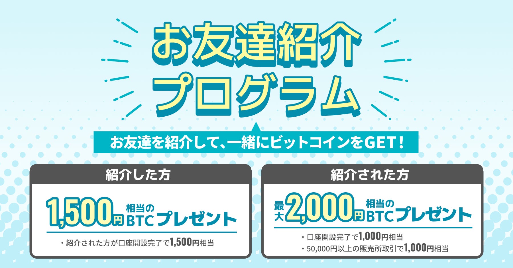 お友達を紹介し、紹介されたお友達が紹介コード・リンクから新規登録を行い、新規登録完了から30日以内に口座開設を完了すると、1人につき1,500円相当のBTC*をプレゼントいたします。