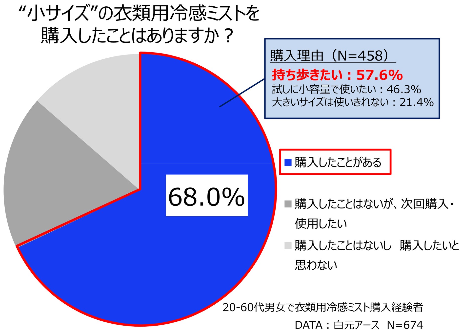 今回、当社が衣類用冷感スプレーについて独自に調査したところ、使用経験者の約7割が小サイズを購入したことがあり、その中の約6割が購入理由として「持ち歩きたいため」と回答しました(下図参照)。