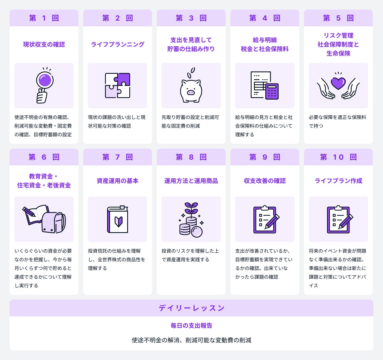 各受講者の関心やレベルに応じて、家計の収支管理やライフプランニング、貯蓄、投資、保険、自動車や住まいの購入、税金対策などのレッスンを組み合わせて学べます。