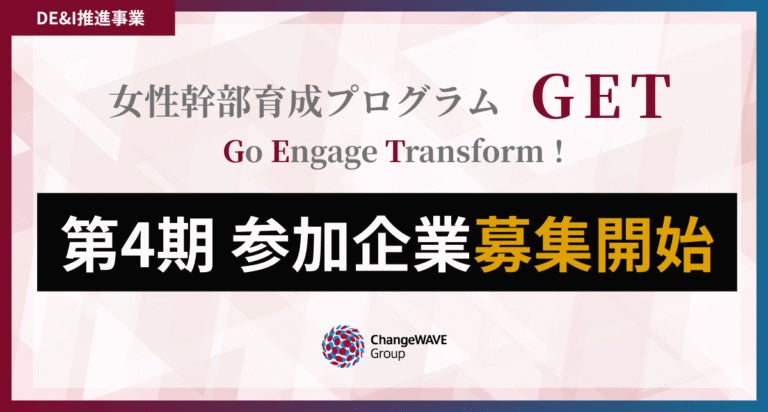 組織変革・経営人材育成を行う株式会社チェンジウェーブグループ(本社:東京都港区、代表取締役社長CEO:佐々木裕子)は、女性幹部候補を対象とした実践型育成プログラム「GET(Go, Engage, Transform)」第4期の参加企業募集を開始したことをお知らせいたします。