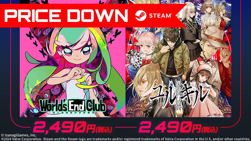 株式会社イザナギゲームズ(東京都江東区、プロデューサー兼CEO:梅田慎介)は、『ワールズエンドクラブ【World's End Club】』、『冤罪執行遊戯ユルキル』の2作品のSteam版を2024年4月3日に値下げする価格改定を発表いたしました。