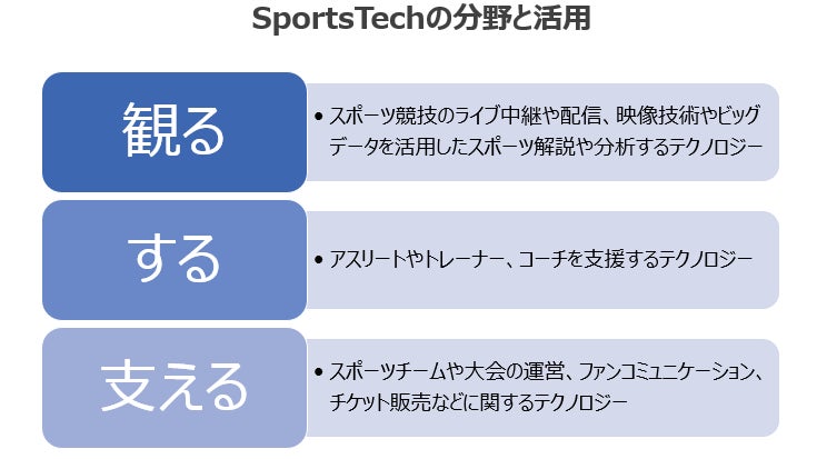 なお、スポーツテックにおいて、一般的には「観る(Watch)」「する(Play)」「支える(Support)」の3つの分野に分類されます。