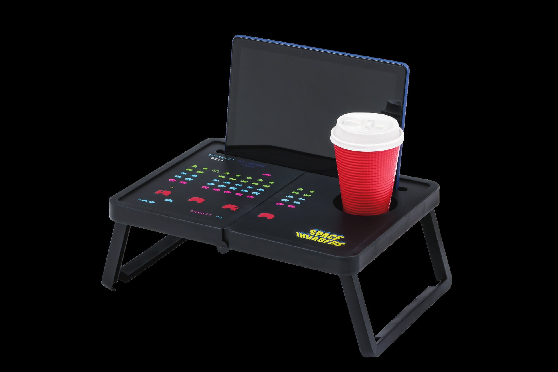 スペースインベーダーのゲーム画面が描かれたコンパクトな折り畳み式マルチテーブルと、スペースインベーダーのヒストリーからここでしか読めないスペシャルコンテンツまでを含む小冊子のセットです。