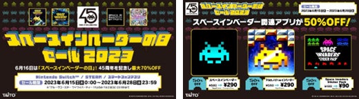 45周年を迎える『スペースインベーダー』を記念して、対象となるNintendo Switch™用ソフト(ダウンロード版)やSteam用ソフト、スマートフォンアプリ等が最大70%オフとなる、「スペースインベーダーの日記念セール」を実施いたします。ぜひ、この機会にお楽しみください。