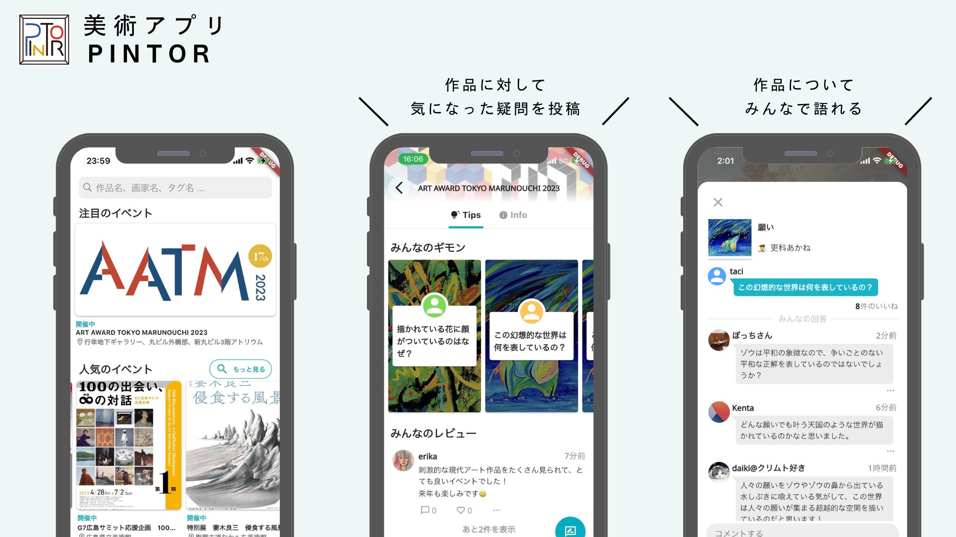 「PINTOR(ピントル)」は現在開催されているアートイベントを見つけることができるスマートフォンアプリです。また、イベントだけではなく、10万件以上の作品、8000人以上の画家から芸術様式や色合い、別のユーザーのコレクションなどから、自分にとって最高の作品を見つけることができます。作品の解説や画家のプロフィールなどを見て、レビューやコレクションをしてアートの記録を取って楽しむこともできます。