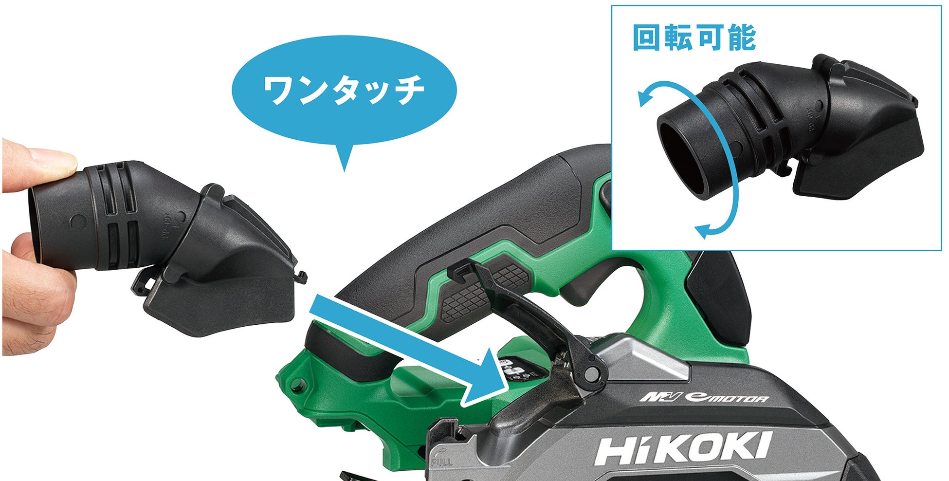 従来のネジ固定からツールレスのワンタッチ着脱方式に変更したことで、簡単に取り付け・取り外しができます。また、ノズルは回転式で、ホースの取り回しがしやすく、切粉の排出方向も自由に変更可能です。