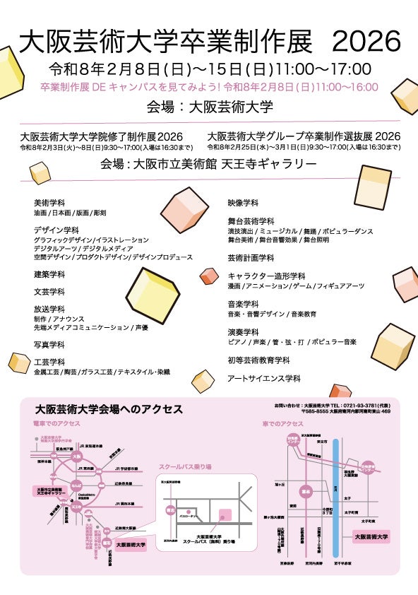 大阪芸術大学(所在地:大阪府南河内郡、学長:塚本 邦彦)は、2026年2月8日(日)から15日(日)の期間、学生たちの4年間の集大成を公開する「大阪芸術大学 卒業制作展 2026」を開催いたします。本展は、学生たちにとって学びの集大成であるとともに、学内各所で多彩なプログラムが繰り広げられる大規模イベントです。