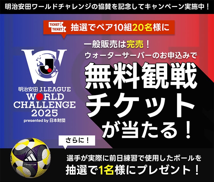 「明治安田Jリーグワールドチャレンジ2025 presented by 日本財団」への協賛を記念して、2025年7月8日(火)~7月21日(月)の期間中にプレミアムウォーターを新規でご契約いただいた方の中から抽選で10組20名様に、「横浜F・マリノスvs.リヴァプールFC 無料観戦ペアチケット」が当たるキャンペーンを実施しています。さらに、上記ご当選者様の中から1名様には、「選手が実際に前日の練習で使用した練習球」をプレゼントいたします。