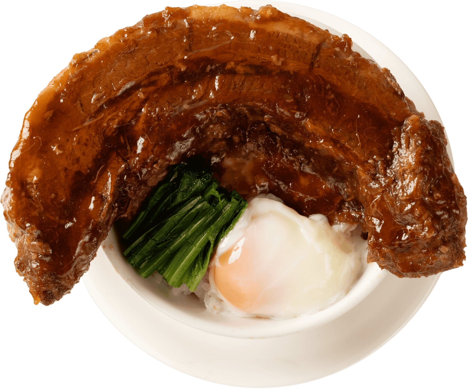 「豚脂」を想起させる大きな角煮がのった角煮丼。