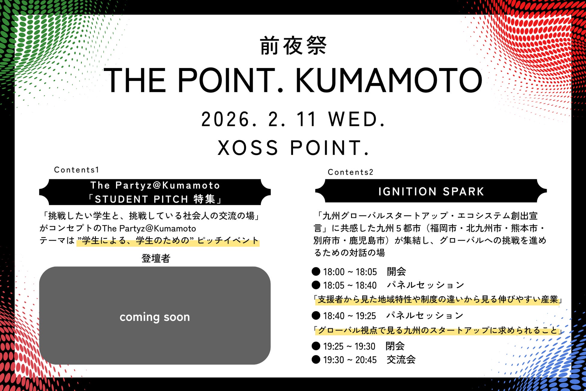 THE POINT. KUMAMOTOの前夜祭として、2月11日(水)XOSS POINT.にて2つのコンテンツを開催します。熊本市がこれまで耕してきた”挑戦を生み出す土壌”を背景に、次世代の挑戦者や九州から世界を見据える支援者が一堂に会する特別企画が実現します。