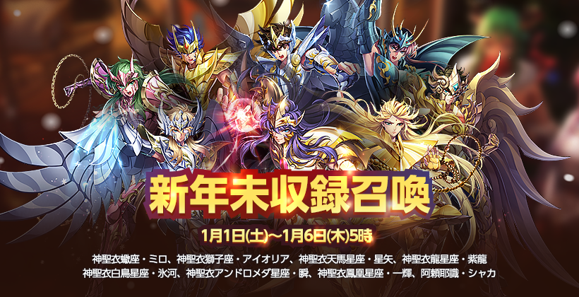 <新年未収録召喚 闘士ラインナップ(全8名)>:神聖衣・蠍座・ミロ、神聖衣・龍星座・紫龍、神聖衣・白鳥座・氷河、神聖衣・鳳凰星座・一輝、神聖衣・アンドロメダ星座・瞬、神聖衣・天馬星座・星矢、阿頼耶識・シャカ、神聖衣獅子座・アイオリア