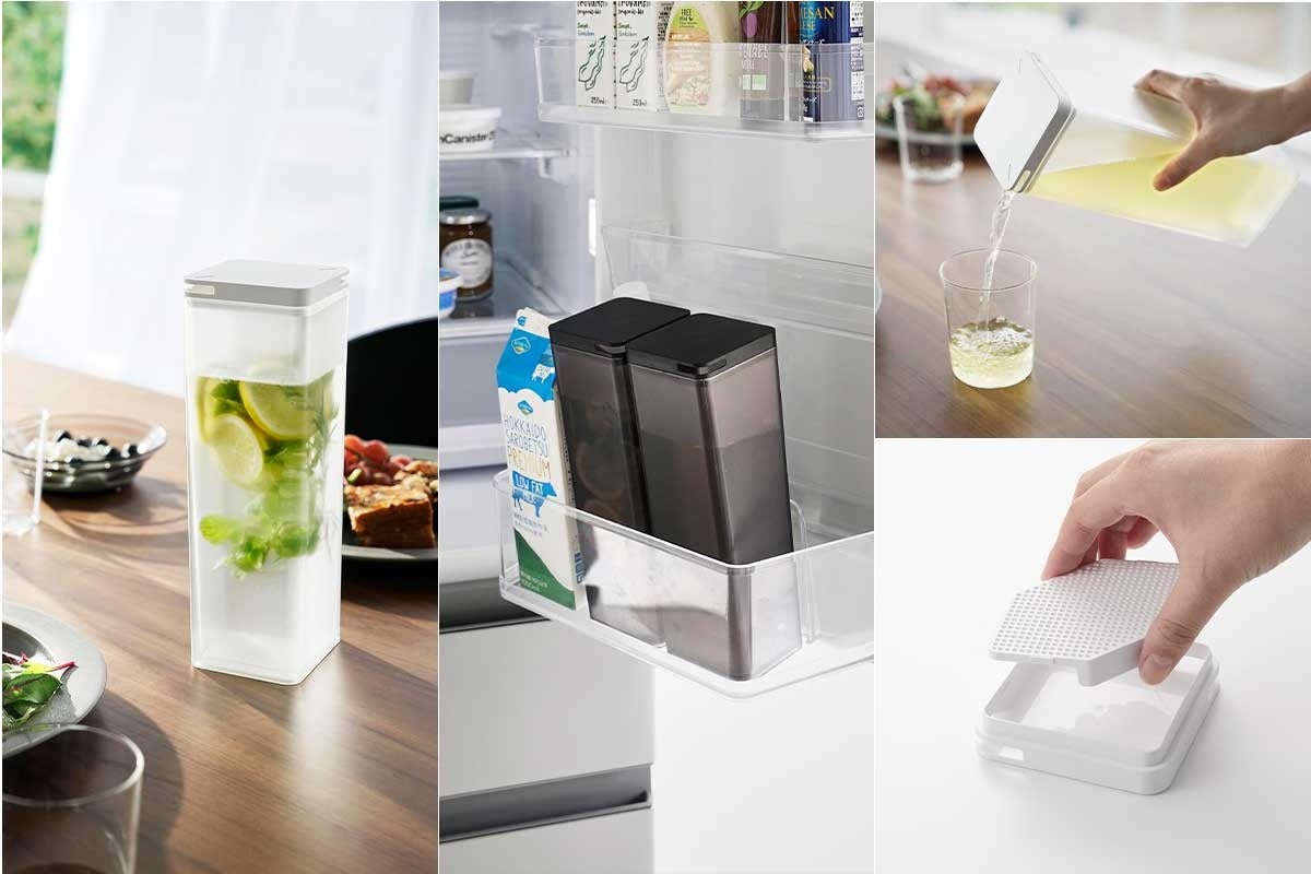 冷蔵庫のドアポケットにも収納しやすい角型で、ドア開閉時などに水がはねてこぼれるのを防ぐために、蓋裏に水はね防止フィルターが付いています。